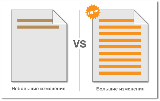 Возраст веб-страницы или домена не единственный фактор свежести. Поисковые системы могут по-разному оценивать контент, который обновляется регулярно от содержания того документа, который не изменяется вообще. В этом случае количество изменений на странице играет роль в ранжировании. Однако изменение одного предложения не будет иметь большого воздействия на свежесть, то есть важен также объем вносимых изменений.